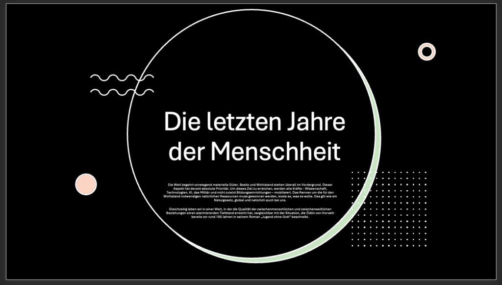 Gleichzeitig leben wir in einer Welt, in der die Qualität der zwischenmenschlichen und zwischenweltlichen Beziehungen einen alarmierenden Tiefstand erreicht hat, vergleichbar mit der Situation, die Ödön von Horvath bereits vor rund 100 Jahren in seinem Roman „Jugend ohne Gott“ beschreibt.